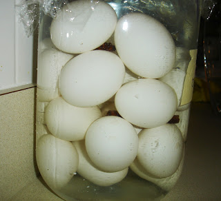 Chẳng hiểu sao mẹ để trứng vào rất nhẹ tay mà qua hai ngày sau lại thấy có hai trứng bị nứt. Chẳng hiểu !! Cũng không dám lấy ra, vì sợ lại va chạm và làm vỡ thêm những trứng khác. Thôi đành chịu trận chờ thêm tháng nữa coi sao (nghe nói là phải đến 40 ngày sau mới mặn ) ^o^